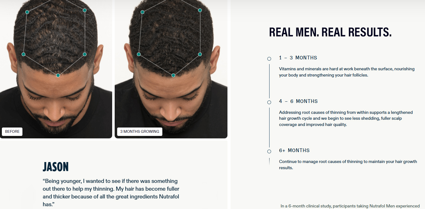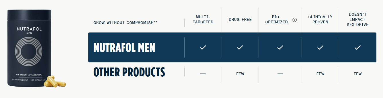 Nutrafol is a daily hair supplement designed for men experiencing hair thinning or early hair loss. Our clinically-backed formula uses stress adaptogens and targeted nutrition to address the root causes of hair loss—hormones, stress, and nutritional deficiencies. This 100% drug-free supplement strengthens hair from within and promotes thicker, healthier growth without affecting sexual health. Available for men, postpartum hair recovery, and as a complementary hair serum. See visible results in 8-12 weeks.